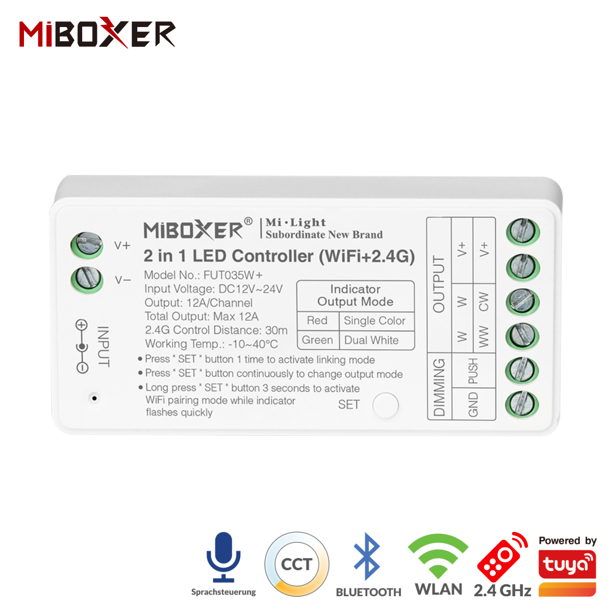 Mit diesem kleinenSteuergerät lassen sich sowohl einfarbige(entweder Kaltweiß ODER Warmweiß) Led Streifen, wie auchCCT LED Streifen (Farbwechsel von Warmweiß zu Kaltweiß) steuern. Ebenso ist das stufenlose Dimmen von einfarbigen bzw. CCT-Stripes, Strahlern usw. möglich. FUT035W+ kann mit WiFi direkt verbunden werden, es benötigt keine Gateway.