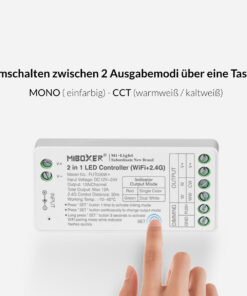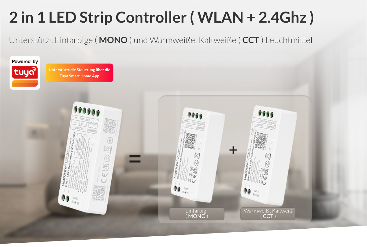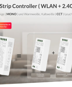 Es können mehrere LED-Steifen so wie andere Leuchtmittel mit einem Controller verbunden werden, so dass mehrere LED-Streifen oder andere Leuchtmittel wie Spots eine Gruppe/ Zone bilden können. Jede Gruppe muss mindestens einen Controller haben, es können aus technischen Gründen aber auch mehrere Controller in einer Zone sein.Dieser Controller kannEinfarbige undCCT-Streifen steuern.