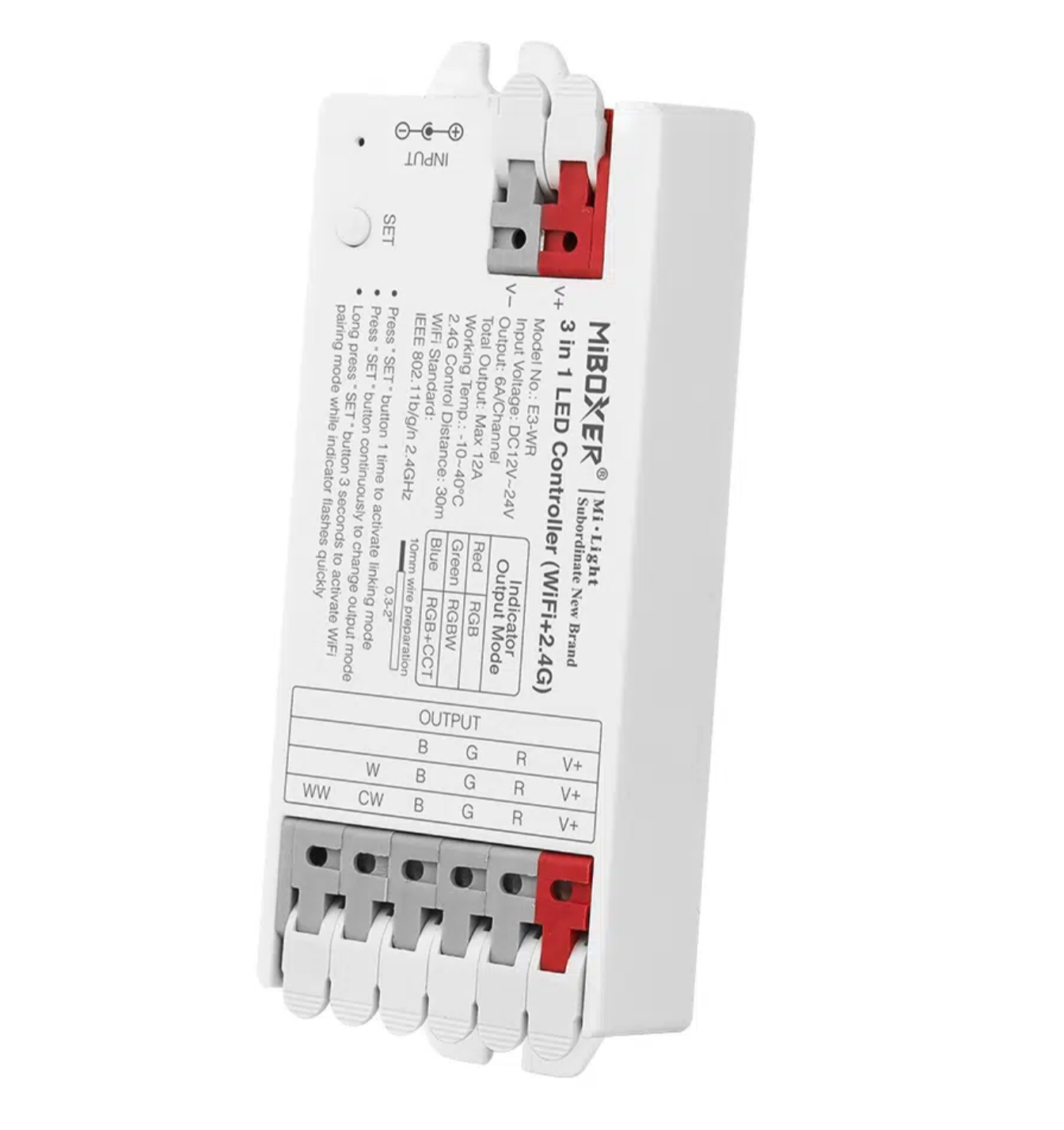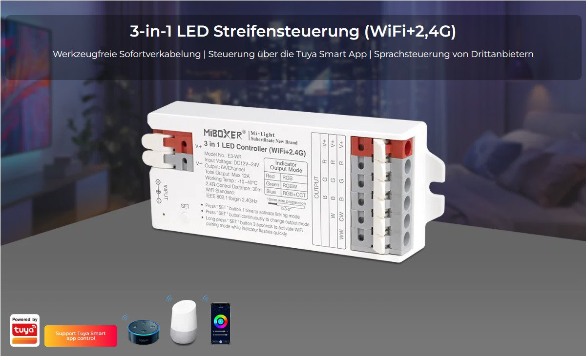 Dieses Steuergerät E3-WR ist der Nachfolger für die Modelle FUT037W+, FUT037W, FUT038W, FUT039W. Dieser koppelt alle folgenden Funktion RGB / RGBW / RGB+CCT in einem. Eingesetz wird dieser Controller bei Farbwechsel und stufenlosem Dimmen von farbigen LED – Strips, Strahlern oder anderen LED-Leuchtmitteln. E3-WR kann mit WiFi direkt verbunden werden, es benötigt keine Gateway. Durch die Repeater-Funktion können durch den Einsatz mehrerer Controller können größere Reichweiten erzielt werden.