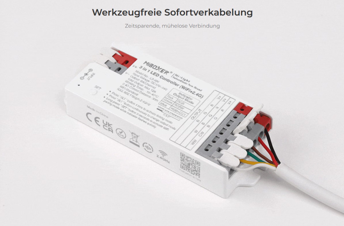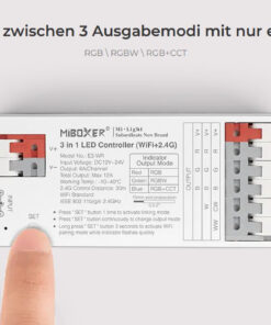 Mittels der SET Taste auf dem Controller können Sie zwischen den 3 Beleuchtungsmodi (RGB, RGBW, RGB/CCT) wechseln.