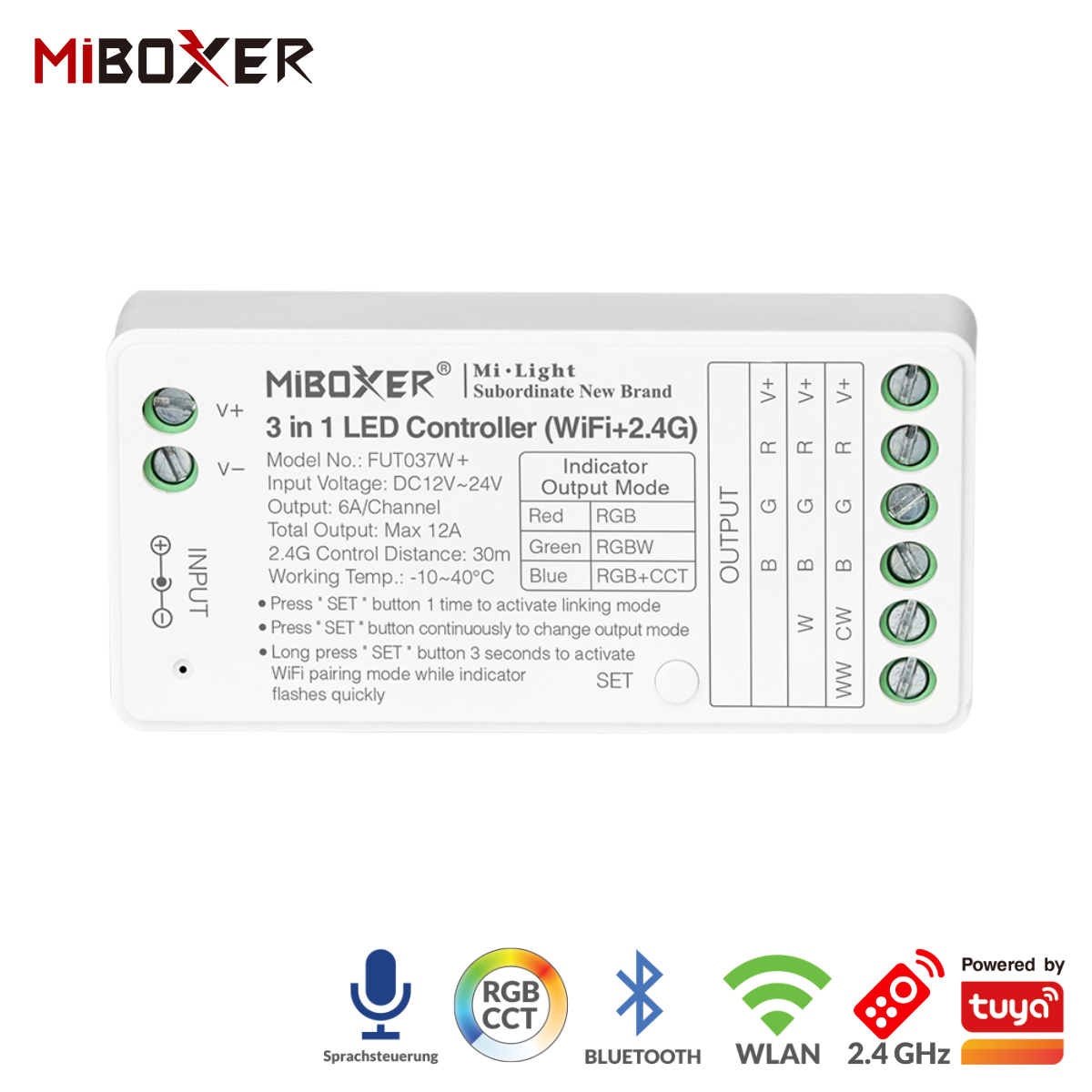 Dieses mini Steuergerät ist der Nachfolger für die Modelle FUT037W, FUT038W, FUT039W, dieser koppelt alle folgenden Funktion RGB / RGBW / RGB+CCT in einem. Eingesetz wird dieser Controller bei Farbwechsel und stufenlosem Dimmen von farbigen LED – Strips, Strahlern oder anderen LED-Leuchtmitteln. FUT037W+ kann mit WiFi direkt verbunden werden, es benötigt keine Gateway. Durch die Repeater-Funktion können durch den Einsatz mehrerer Controller können größere Reichweiten erzielt werden.