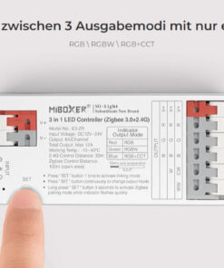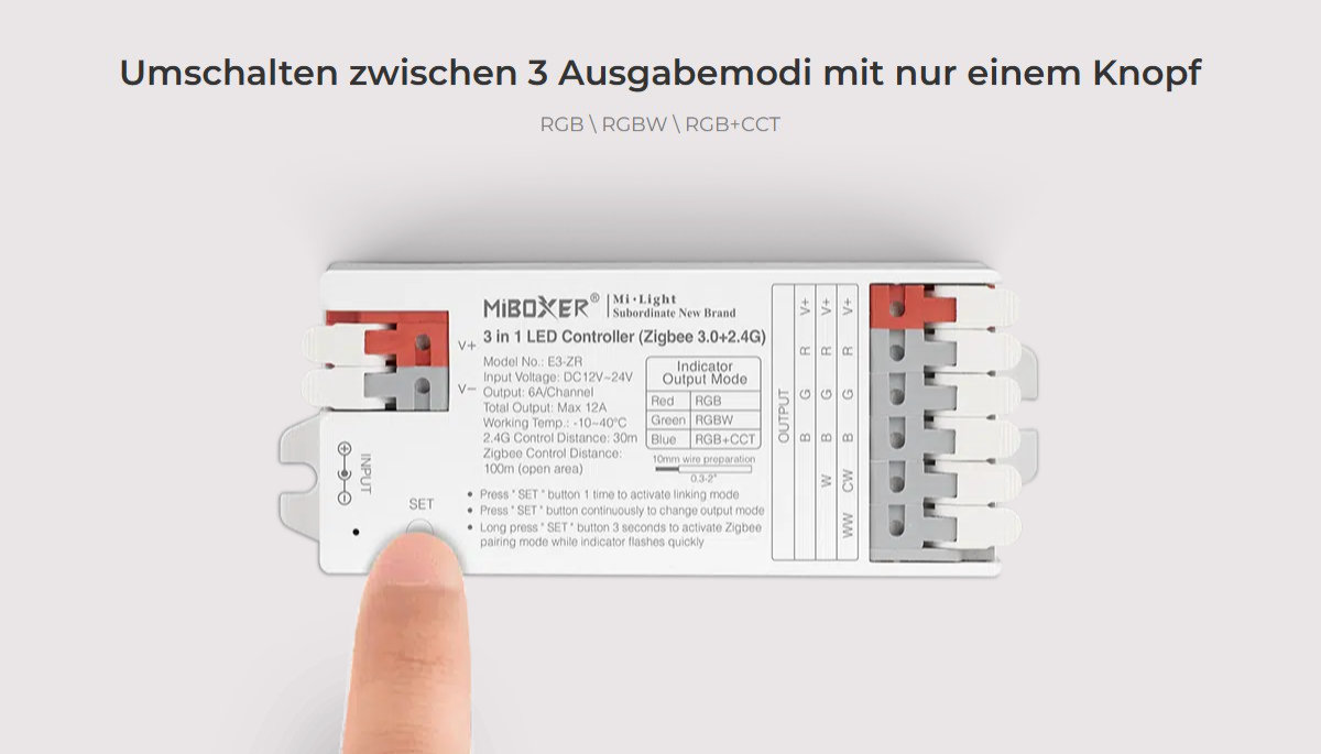 Mittels der SET Taste auf dem Controller können Sie zwischen den 3 Beleuchtungsmodi (RGB , RGBW , RGB/CCT) wechseln.