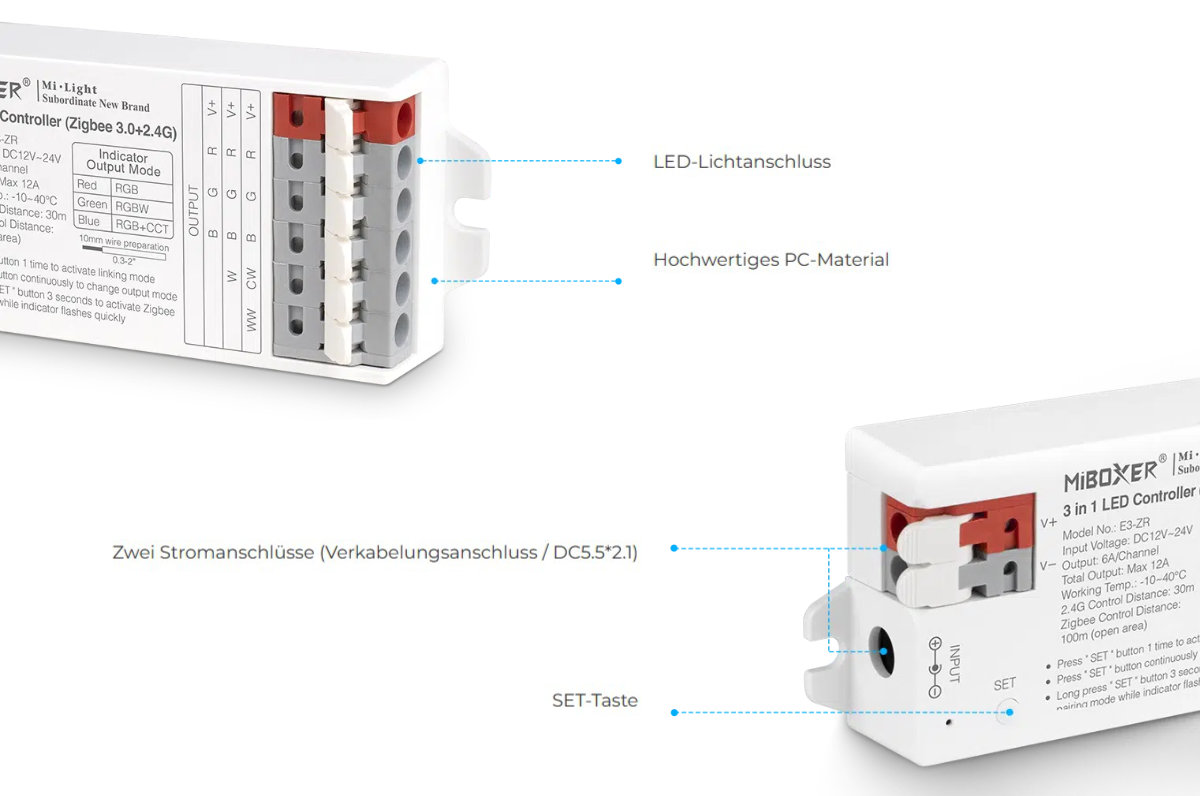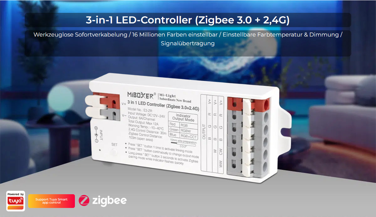 Der moderne Controller wird zum stufenlosem Dimmen, Farbwechsel und zur Einstellung der Farbsättigung von RGB LED-Strips, Strahlern und LED-Spots eingesetzt. Der Funkstandard Zigbee zeichnet sich durch Einfachheit in der Anwendung, hohe Flexibilität und Energieeffizienz aus. Durch den Funkstandard Zigbee können die unterschiedlichsten Geräte auf kurzen Wegen mit einander vernetzt werden. Die Endgeräte nutzen das Netzwerk autark. In der Smart Home Branche hat sich der Funkstandart Zigbee sehr gut etabliert und wird von den meisten namhaften Herstellern verwendet. Auf dem Markt gibt es viele Produkte, die in das Netzwerk mit eingebunden werden können, um ihr Heim smarter und dadurch bequemer, einfacher und schöner zu machen. Der E3-ZR Controller kann mit einer Fernbedingung (ist im Shop zu erwerben), mit der kostenlosen App und Sprachsteuerung bedient werden (benötigt dazu ein Zigbee Gateway).