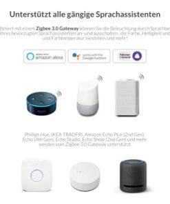 Sprachsteuerung(Philips Hue, IKEA TRADFRI,Amazon Alexa(ab 2 Gen.), Google Home, Echo (4 Gen.), Echo Studio, Echo show (2 Gen.) (es wird ein Zigbee Gateway 3.0 benötig)