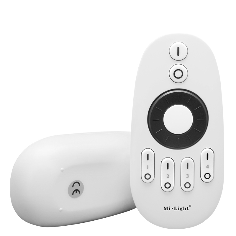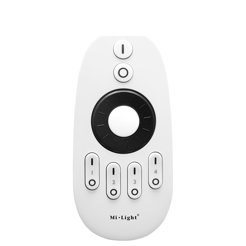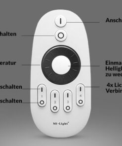 Die smarte CCT – Fernbedienung von Mi-Light ist ein High-End Controller mit Drehrad. Das batteriebetriebene, handliche Steuergerät für Dual White CCT LED-Streifen und andere Leuchtmittel wie Strahler oder Spots wird für folgende Funktionen genutzt: Dimmer, Ein/Aus Schalter, Farbtemperaturwechsel. Die Steuerung funktioniert mit Hilfe des Drehrades, welches sich intuitiv bedienen lässt.