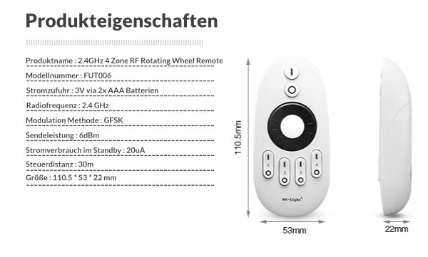 Die Fernbedienung kann bis zu 4 Zonen (für jede Zone ist mind. 1 Controller notwendig) steuern. Es werden 2 AAA Batterien benötigt, die nicht mit im Lieferumfang enthalten sind. Die Reichweite dieser Fernbedienung beträgt 30m. Daher können Sie Ihre Geräte auch über eine größere Entfernung steuern.