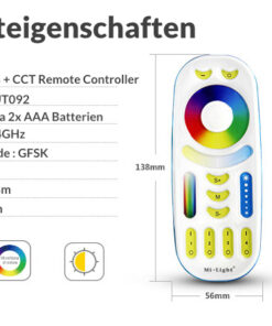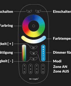 Diese moderne Fernbedienung mit Touch-Bedienfeld kann Ihre RGB + CCT LED-Beleuchtung mit Leichtigkeit steuern. Mit dem Steuergerät können Sie die entsprechenden Lampen dimmen, die Farben wechseln oder die Farbtemperatur und Sättigung einstellen. Es können bis zu 4 Zonen unabhängig voneinander gesteuert werden.