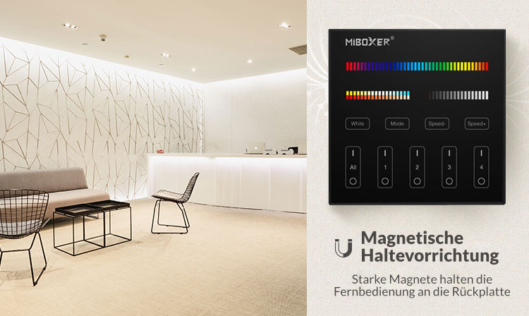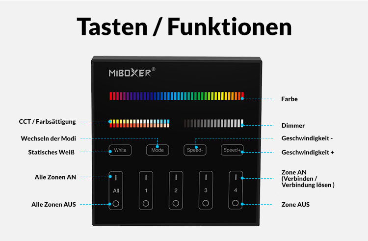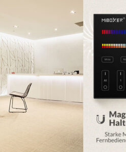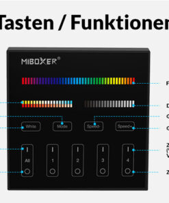Die intelligenten Panel-Controller von Mi-Light sind wahre High-End Controller mit TouchScreen. Das TouchScreen ist besonders Kratzfest. Das batteriebetrieben Panel für bunte RGB+CCT LED-Streifen wird für folgende Funktionen genutzt: Dimmer, Ein/Aus Schalter, Farbtemperaturwechsel, Farbwechsel und einstellen der Farbsättigung. Das Panel kann bis zu 4 Zonen separat bedienen.