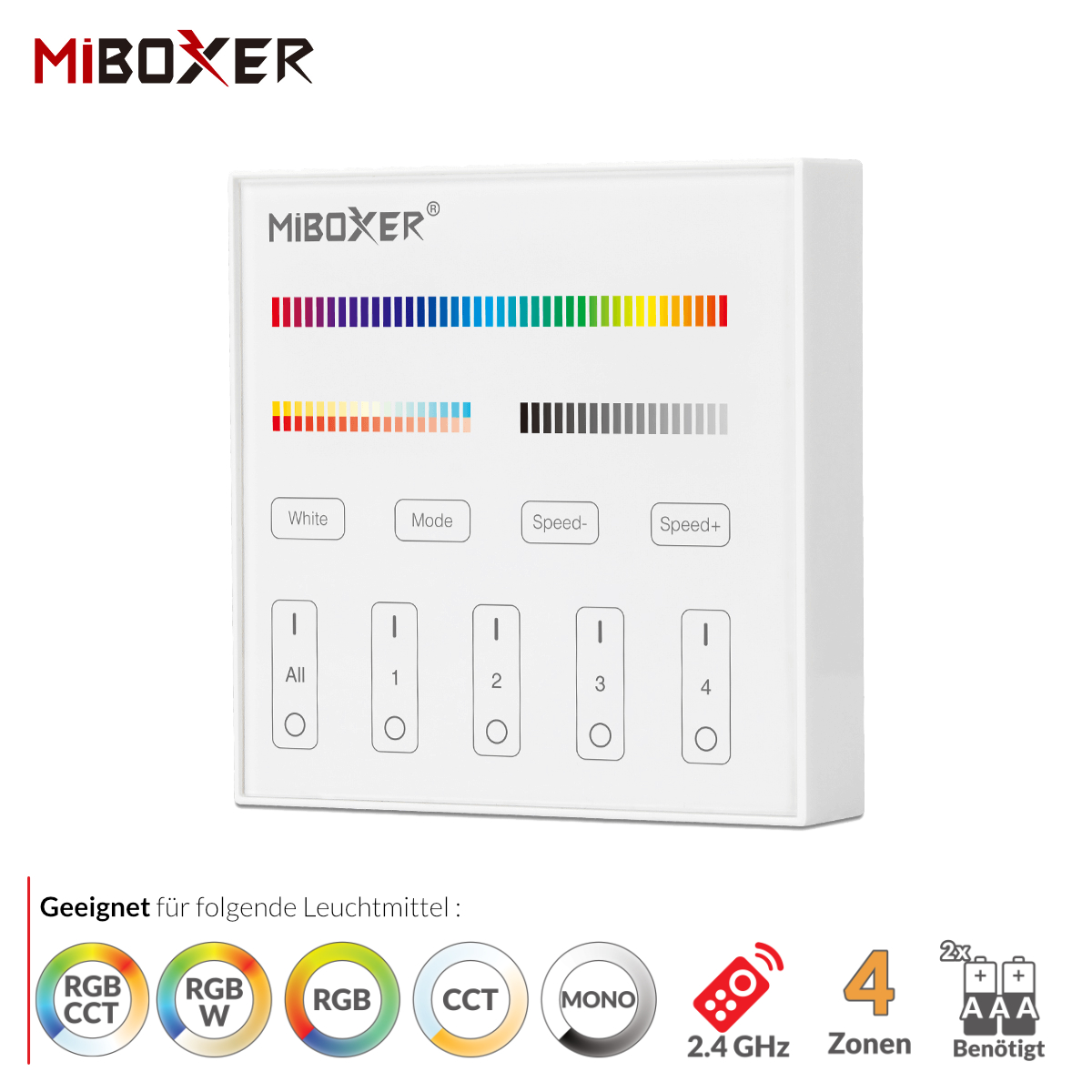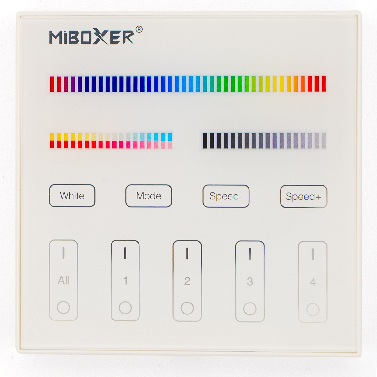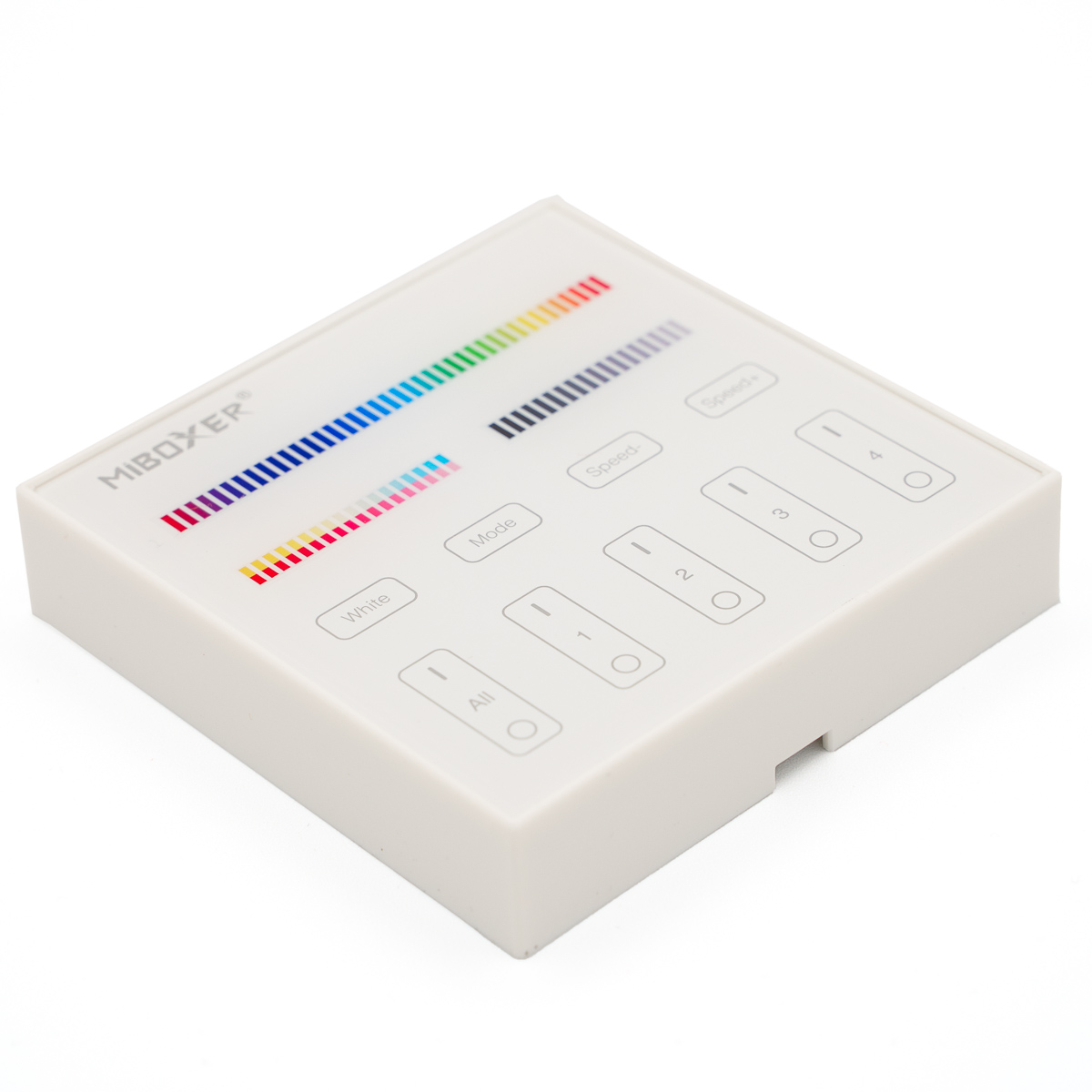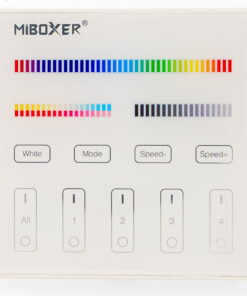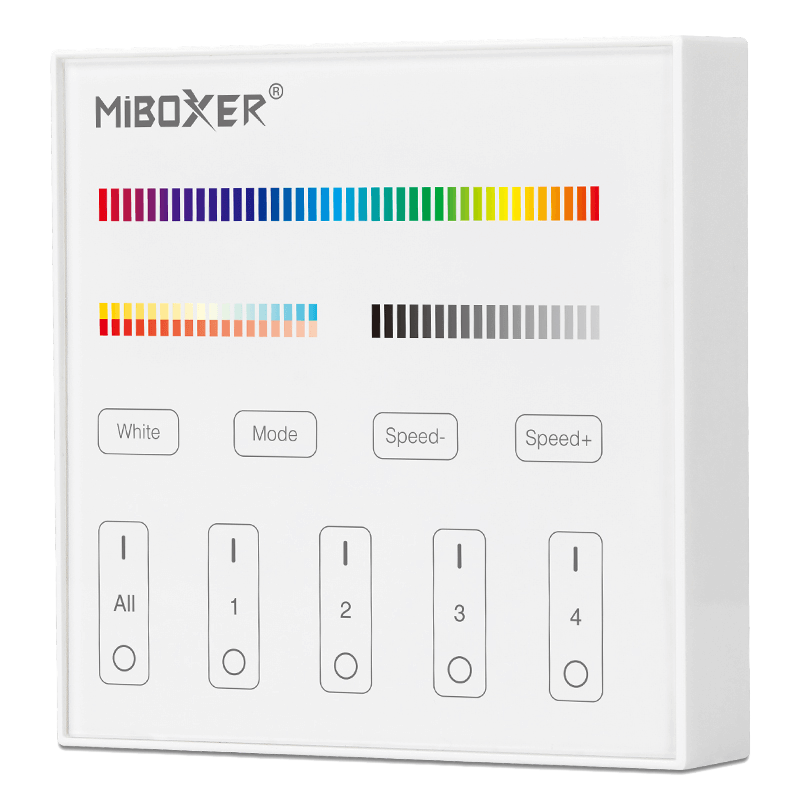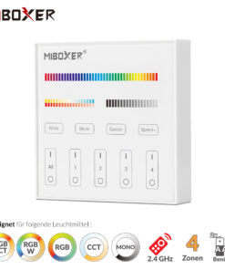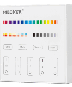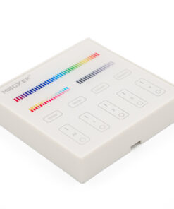 Die intelligenten Panel-Controller von Mi-Light sind wahre High-End Controller mit TouchScreen. Das TouchScreen ist besonders Kratzfest. Das batteriebetrieben Panel für bunte RGB+CCT LED-Streifen wird für folgende Funktionen genutzt: Dimmer, Ein/Aus Schalter, Farbtemperaturwechsel, Farbwechsel und einstellen der Farbsättigung. Das Panel kann bis zu 4 Zonen separat bedienen.