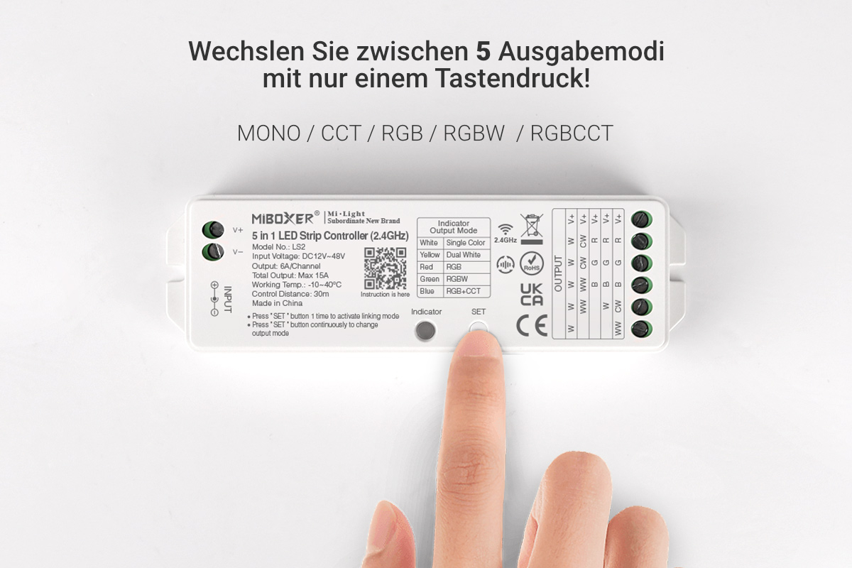 Mittels der SET Taste auf dem Controller können Sie zwischen den 5 Beleuchtungsmodi (MONO, CCT, RGB , RGBW , RGB/CCT) wechseln.