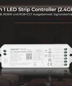 Dieser Mi-Light Controller ist vielseitig einsetzbar. Er kann Einfarbige, Dual White, RGBW, RGB+CCT-Streifen steuern. Zu den Steuerungsmöglichkeiten gehören Dimmen, Einstellen der Farbtemperatur, Farbsättigung und Farbwechsel. Durch den obligatorischen Einsatz des 2,4 GHz Gateways ist es möglich, den Controller per Sprachsteuerung zu bedienen. Alternativ können auch die Fernbedienungen (Artikelnr.: 227612, 227613, 227614, 227615, 227616, 227617, 227618) oder die Mi-Light Smartphone App genutzt werden.