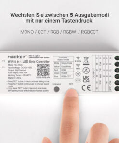 Mittels der SET Taste auf dem Controller können Sie zwischen den 5 Beleuchtungsmodi (MONO, CCT, RGB , RGBW , RGB/CCT) wechseln.