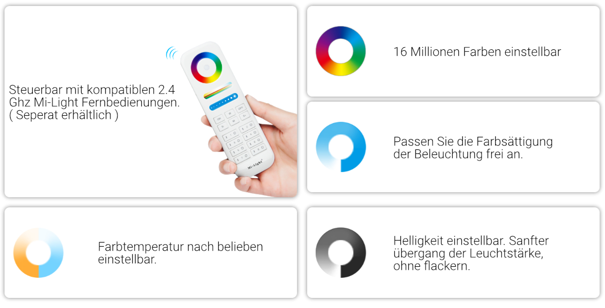 Batteriebetrieben (als klassische Fernbedienung zu benutzen) – mehrere LED-Streifen steuerbar