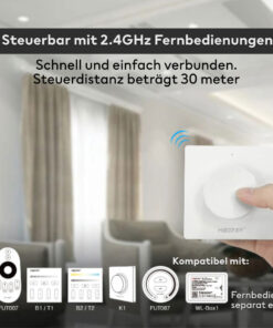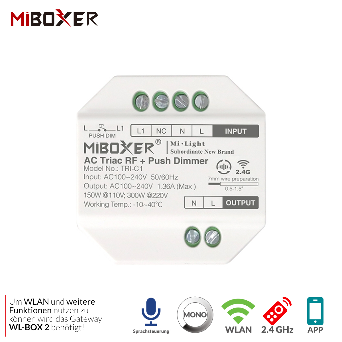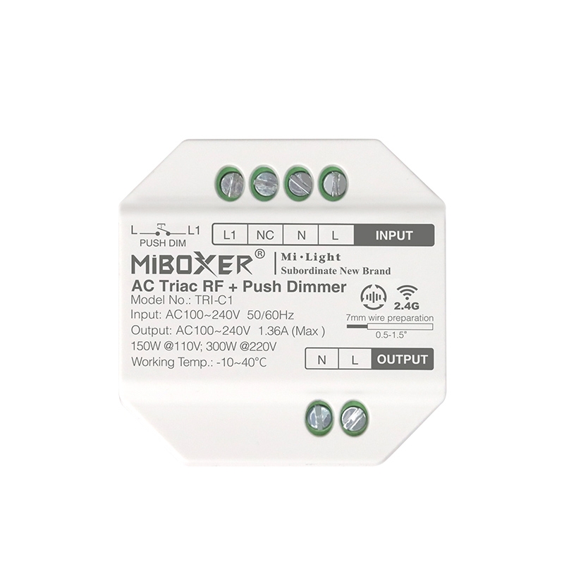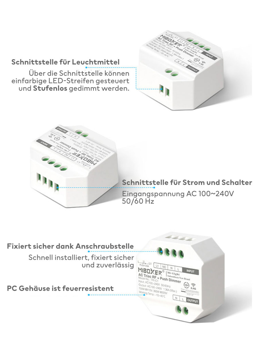 Der AC Triac Push + Funkdimmer wird zum Dimmen einfarbiger Leuchtmittel wie LED-Streifen (Achtung: für LED-Streifen nur mit einem Trafo nutzbar), Standardlampen und Halogenlampen. Dabei darf die Leistung von 300W nicht überschritten werden. Mit einem richtigen Schalter oder Fernbedingung kann die Beleuchtung bequem gesteuert werden(passendes Zubehör im Shop erhältlich).Durch die kompakte Größe passt dieser Funkdimmer in eine Standardunterputzsteckdose. Die kostenlose App von Miboxer kann den Dimmer smart machen. Der Dimmer kann dann mit einem Smart oder Alexa und Google Assistant(Gateway wird benötigt und ist separat im Shop erhältlich) bedient werden.