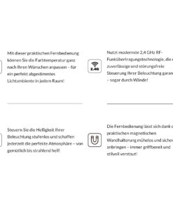 Die Wandfernbedienung lässt sich problemlos an Ihrer bevorzugten Stelle anbringen und fügt sich nahtlos in Ihr vorhandenes Raumdesign ein. Die Bedienung ist kinderleicht: Wählen Sie einfach den gewünschten Lichtmodus, und die Fernbedienung erledigt den Rest. Darüber hinaus kann die Fernbedienung leicht vom Magnethalter abgenommen und als Handfernbedienung verwendet werden.