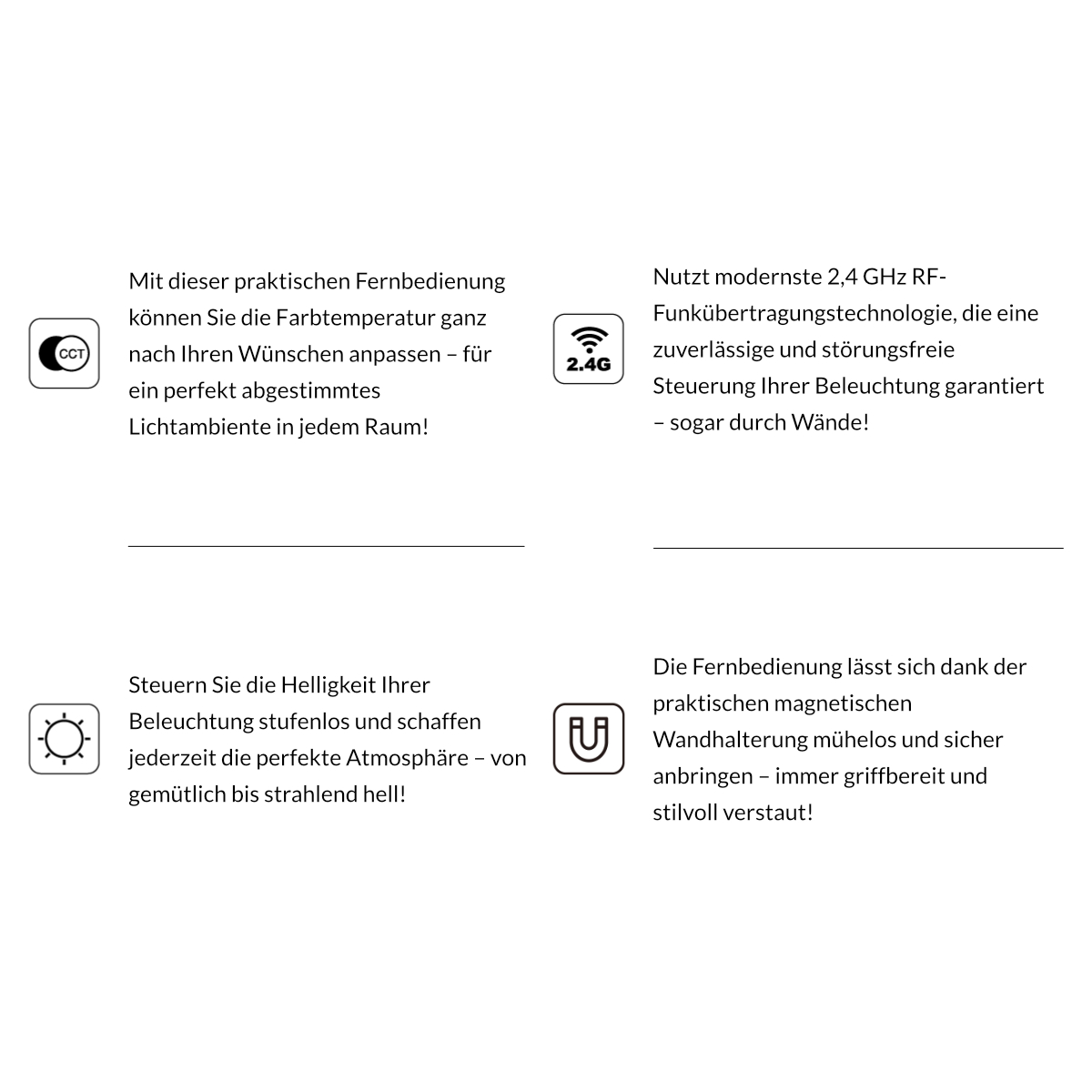 Die CCT Wandfernbedienung ermöglicht eine präzise Anpassung der Helligkeit und Farbtemperatur Ihrer Beleuchtung. Ganz gleich, ob Sie warmes, gemütliches Licht für einen entspannten Abend oder kühles Tageslicht für produktives Arbeiten bevorzugen – mit nur einem Knopfdruck finden Sie die perfekte Lichtstimmung für jede Gelegenheit.