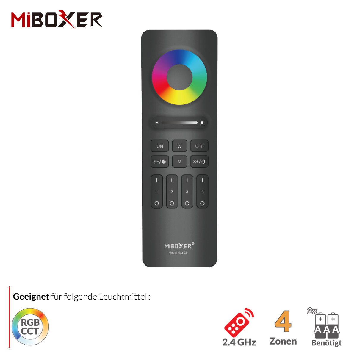 Mit der MiBoxer C5-Fernbedienung können Sie LED-Streifen, kompatible MiBoxer Lampen und Leuchtmittel ganz einfach dimmen, die Farbe und Farbtemperatur (falls unterstützt) regeln. Das Gehäuse ist in Schwarz erhältlich und kann als tragbare Fernbedienung genutzt werden – für maximale Flexibilität bei der Platzierung Ihres RGB CCT-Dimmers. Zudem lässt sich die Fernbedienung magnetisch an eine Wandhalterung anbringen und fügt sich stylish und nahtlos in den Raum ein. Mit dieser Fernbedienung können Sie die Beleuchtung in bis zu 4 verschiedenen Zonen individuell ansteuern und kontrollieren, was eine präzise Lichtsteuerung in unterschiedlichen Bereichen ermöglicht.