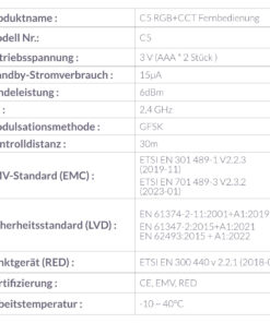 Feineinstellung der Farben, Farbtemperatur und Dimmung per TouchDie RGB CCT Fernbedienung ermöglicht eine präzise Anpassung der Farben, Farbtemperatur und Helligkeit Ihrer Beleuchtung. Mit dieser Fernbedienung können Sie die Beleuchtung in bis zu 4 verschiedenen Zonen individuell ansteuern und kontrollieren. Ganz gleich, ob Sie warmes, gemütliches Licht für einen entspannten Abend, Buntes, freudiges Licht für eine Feier oder kühles Tageslicht für produktives Arbeiten bevorzugen – mit nur einer Berührung finden Sie die perfekte Lichtstimmung für jede Gelegenheit. |