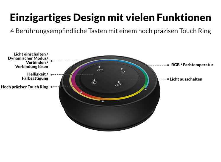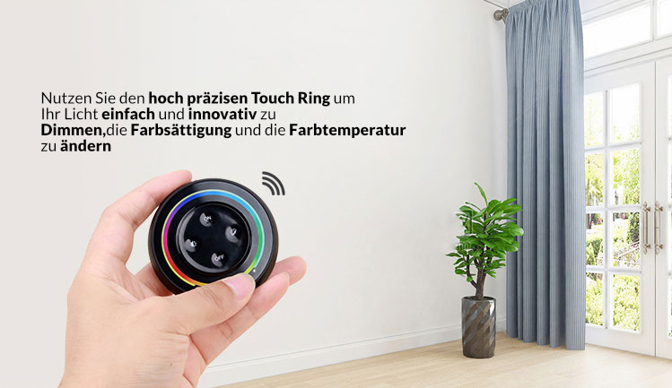 Die Wireless-Steuerung ermöglicht eine drahtlose Bedienung und lässt sich per Touchsensor einfach steuern und reagiert auf jede Fingerbewegung. Eine Magnethalterung die durchs Kleben einfach an einer beliebigen Stelle einer Wand angebracht werden kann, ermöglicht ein einfaches Abnehmen und Zurücklegen der Fernbedingung. Das Design und die hochwertige Produktion und die einfache Bedienung überzeugen.