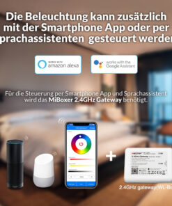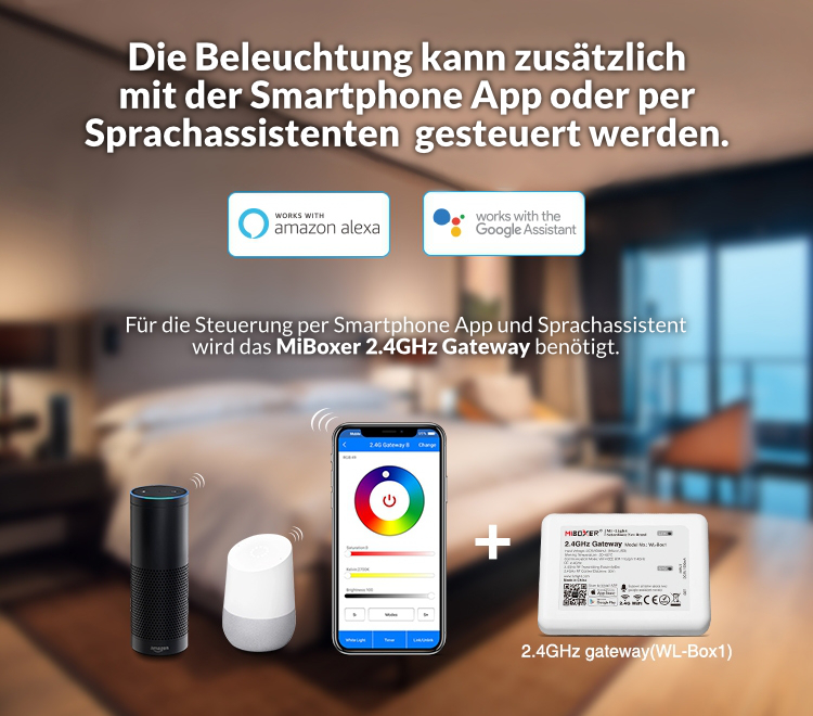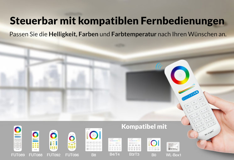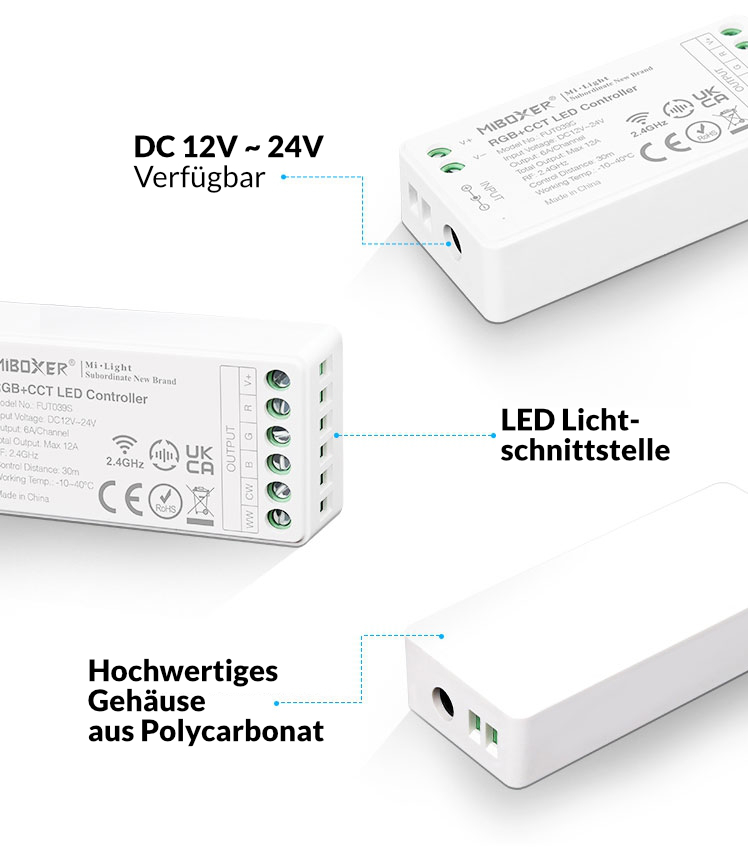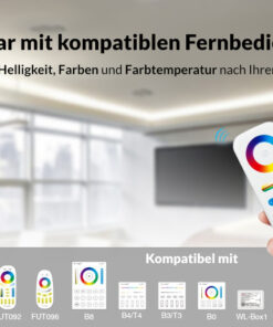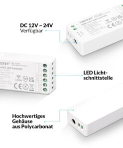 In Kombination mit einer WL-Box1 kann dieser Controller auch per Sprachsteuerung oder App genutzt werden. Mit der App stehen noch viele weitere Funktionen zur Verfügung. Der Controller dient gleichzeitig als Signalverstärker mit einer Reichweite von 30m. Wenn Sie in ausreichendem Abstand mehrere Controller im Einsatz haben, können Sie somit auf einen separaten Verstärker verzichten. Damit lassen sich auch größere Distanzen überbrücken. Dieser Controller kann Einfarbige, RGBW, RGB und CCT-Streifen steuern.