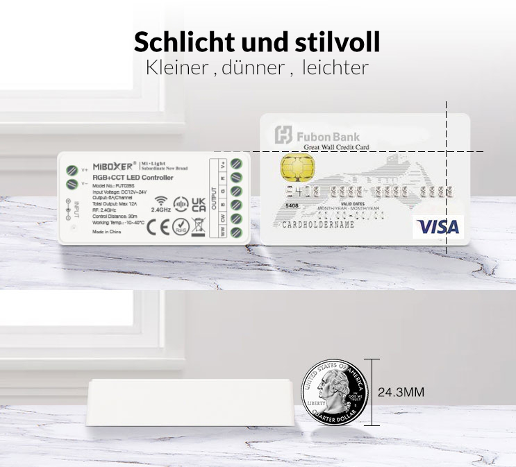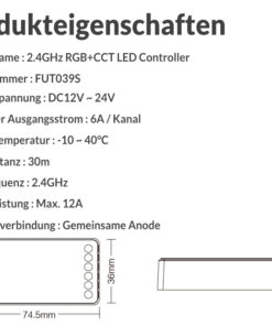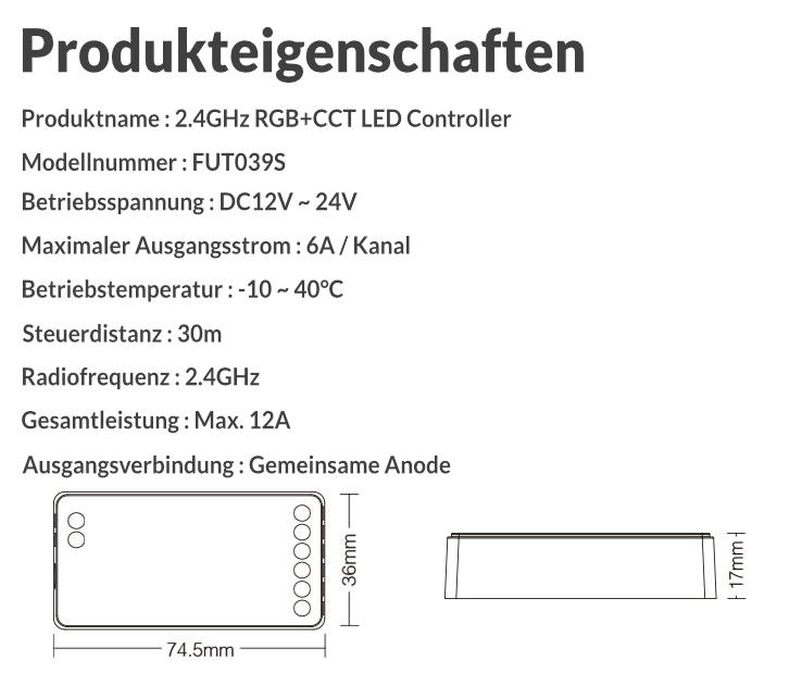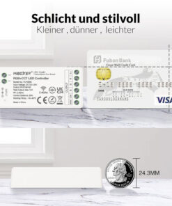 Der kleine und leichte Controller wird zum stufenlosen Dimmen von RGB + CCT LED-Strahlern, LED-Stripes oder anderen LED-Leuchtmitteln eingesetzt. Mit Hilfe einer entsprechenden Steuerung kann man nicht nur die Helligkeit zu steuern, sondern auch die gewünschte Farbe und Farbtemperatur einstellen. Trotz der geringen Größe ist dieser Controller vielfältig einzusetzen.