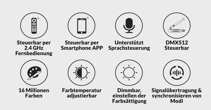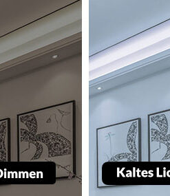 Die Weißtöne können zwischen den Farbtemperaturen von 2700 – 6500 Kelvin gewechselt werden. Damit ist es möglich ein gemütliches warmes Licht bis hin zu einem kalten Arbeitslicht zu generieren.