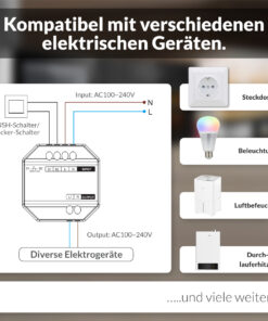 Der AC Triac Push + Funkdimmer wird zum Dimmen einfarbiger Leuchtmittel wie LED-Streifen (Achtung: für LED-Streifen nur mit einem Trafo nutzbar), Standardlampen und Halogenlampen. Dabei darf die Leistung von 300W nicht überschritten werden. Mit einem richtigen Schalter oder Fernbedingung kann die Beleuchtung bequem gesteuert werden(passendes Zubehör im Shop erhältlich).Durch die kompakte Größe passt dieser Funkdimmer in eine Standardunterputzsteckdose. Die kostenlose App von Miboxer kann den Dimmer smart machen. Der Dimmer kann dann mit einem Smart oder Alexa und Google Assistant(Gateway wird benötigt und ist separat im Shop erhältlich) bedient werden.